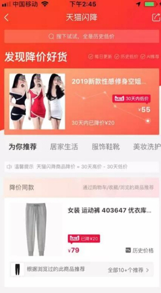 易亚电商了解到,在APP天猫首页,往下拉即就能看到“天猫闪降”入口。APP里的特价好货频道,每日更新,AI推荐,在天猫闪降里搜一搜,全是历史低价商品。