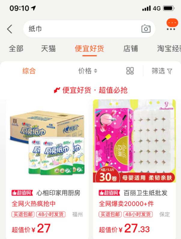 据悉,从今天起,消费者在淘宝APP首页搜索任一商品,如“纸巾”,即可在主搜第三栏看到名为“便宜好货”的特卖区,这是淘宝全面发力下沉市场的最新动作。