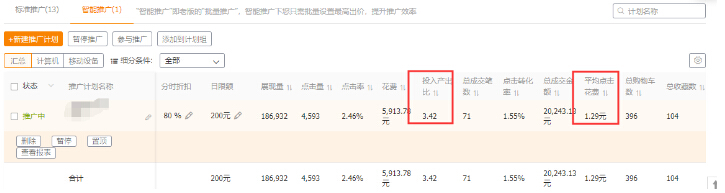 直通车一天付费在1000左右,推广4~5个计划,一款计划的限额在100~200,接手之后针对直通车计划完全优化了一遍关键词和人群,分析了一下生意参谋发现有些款式的流量和转化都不错,所以新加了一个智能计划运用多款测试的方式去推广引流,日限额在100元。之后发现这个计划ppc要比标准的低,投产还是比较不错的,所以这个计划一直在优化中。以下是智能计划的一个数据反馈。