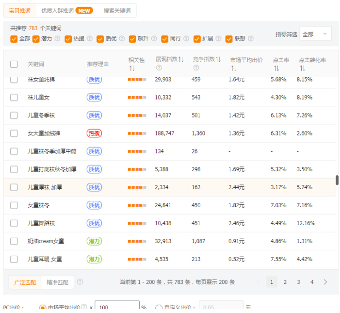 潜力词:有一定展现量并且平均出价和竞争指数都比较低的关键词