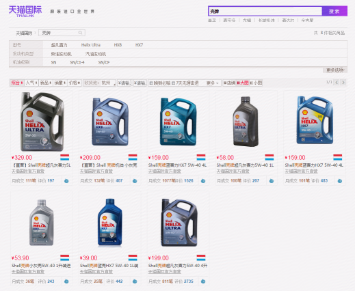 目前在天猫国际上搜索“壳牌”字样,依旧还有多位商家公开售卖壳牌的润滑油产品,且月销量不菲。而对比同样5W-40的“1升装全合成机油”,天猫国际与天猫旗舰店的价位分别是53.9和150元,两者价位悬殊巨大,间接导致天猫壳牌官方旗舰店的月销售额受到冲击影响。