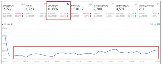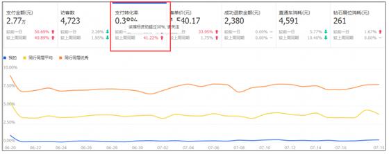 打开生意参谋,在首页就可以看到你的综合支付转化率跟同行同层均值对比的情况,一般情况(我这里为什么说一般情况,因为还有特殊的),如果你的这个综合支付转化率远低于行业均值的话,都意味着你在消化流量的能力上是不行的,显而易见的,搜索引擎就会减少对你免费自然搜索流量的扶植。