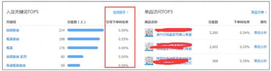 你像这个店铺,我现在看到的是最近30天的PC端的数据,排名前五的进店关键词,除了第二个“餐具套装”有0.53%的下单转化率以外,另外的四个关键词的下单转化率都是0,这至少说明对于PC端来讲,进店关键词是非常不精准的。