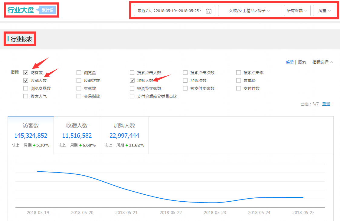 市场行情---行业大盘---行业报表:查看访客数,收藏人数,加购人数。这里看7天的数据,最近7天的数据综合数据指标是最准确的。选择自己主营类目,选择所有综端,销售网络,根据自己店铺是天猫的就选天猫,是淘宝的就选淘宝。