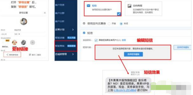 淘宝粉丝群相信大家都知道,作为店铺可以通过客户运营平台圈定我们的目标客户,通过短信推送提醒客户加入我们的专属粉丝群。(如下图)这样就达到了短信与其他渠道的有效结合,而不仅仅只是通知客户直接回来购买。
