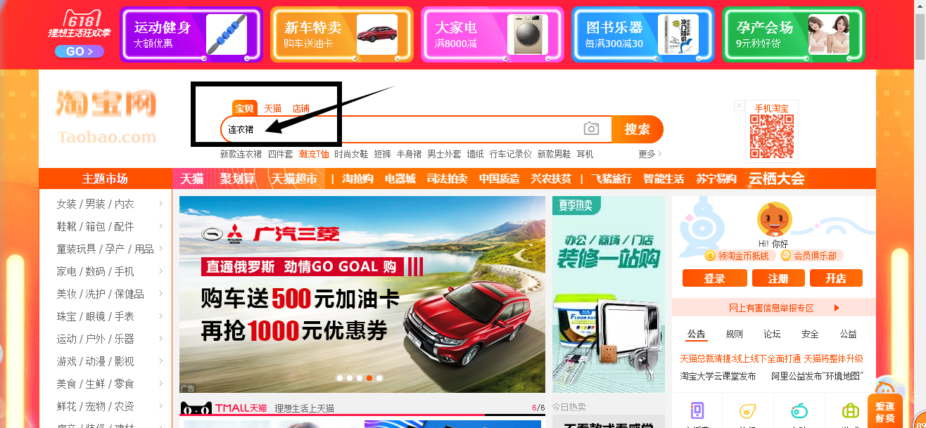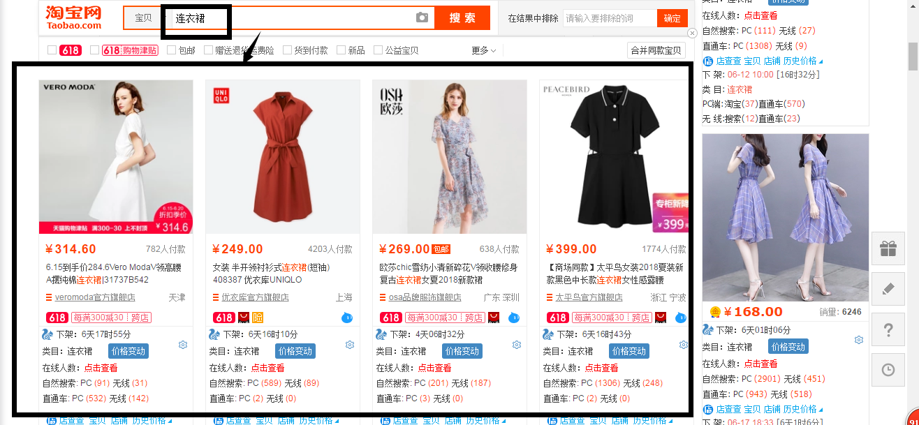 ①首先在淘宝网首页搜索想要商品的关键词,比如“连衣裙”