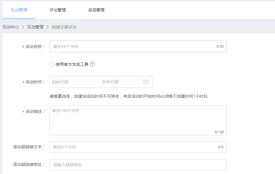 4、注:在创建活动页面中,填写一些必填项,活动名称可以写一些晒图有礼,买家秀征集或者自己定义一个活动的名称都可以,如果奖品全部都是优惠券的,那么建议使用官方发奖工具,如果是送实物的,我建议不使用官方发奖工具。